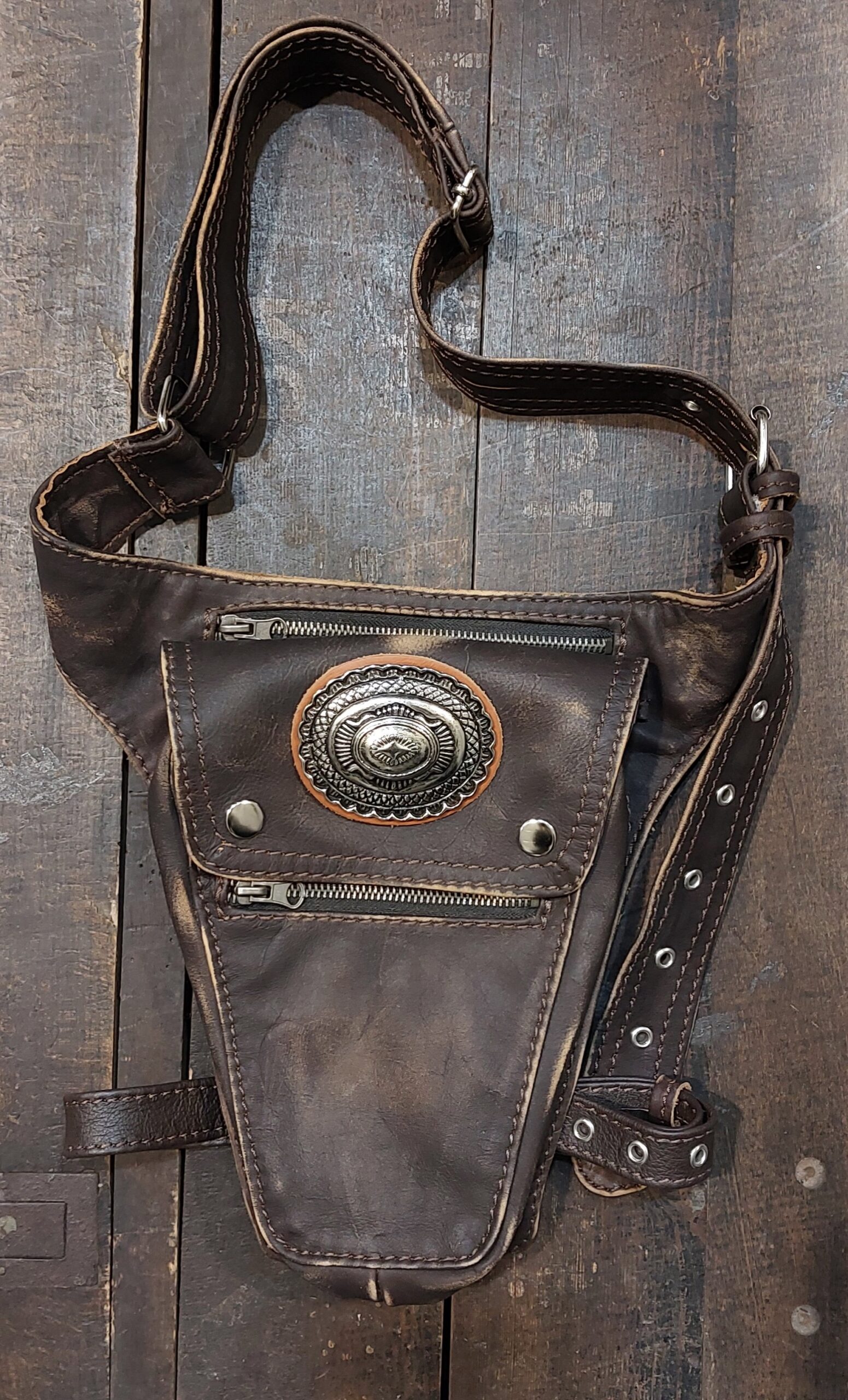 Skórzana saszetka motocyklowa. Mocowana na pas i nogę. Uszyta z mocnej skóry naturalnej. Kolor brązowy, lekko przecierany. Saszetkę ozdobiliśmy dodatkowo metalowym motywem.