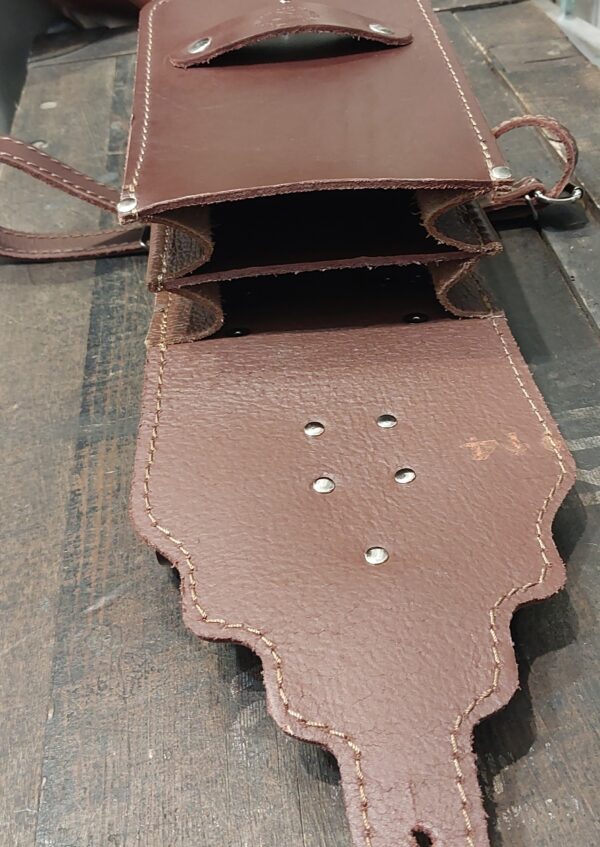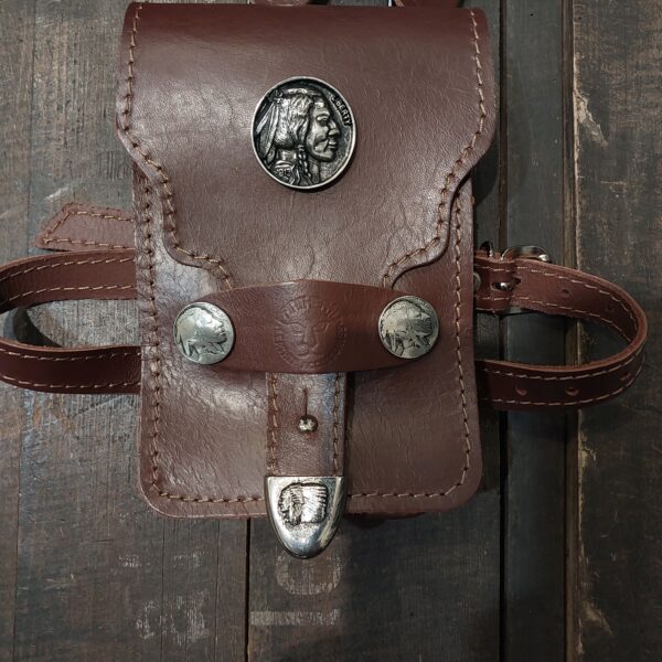 Saszetka wykonana została z grubej skóry bydlęcej, z dbałością o każdy detal. Dodatkowo ozdobiona metalowymi motywami Indianina.