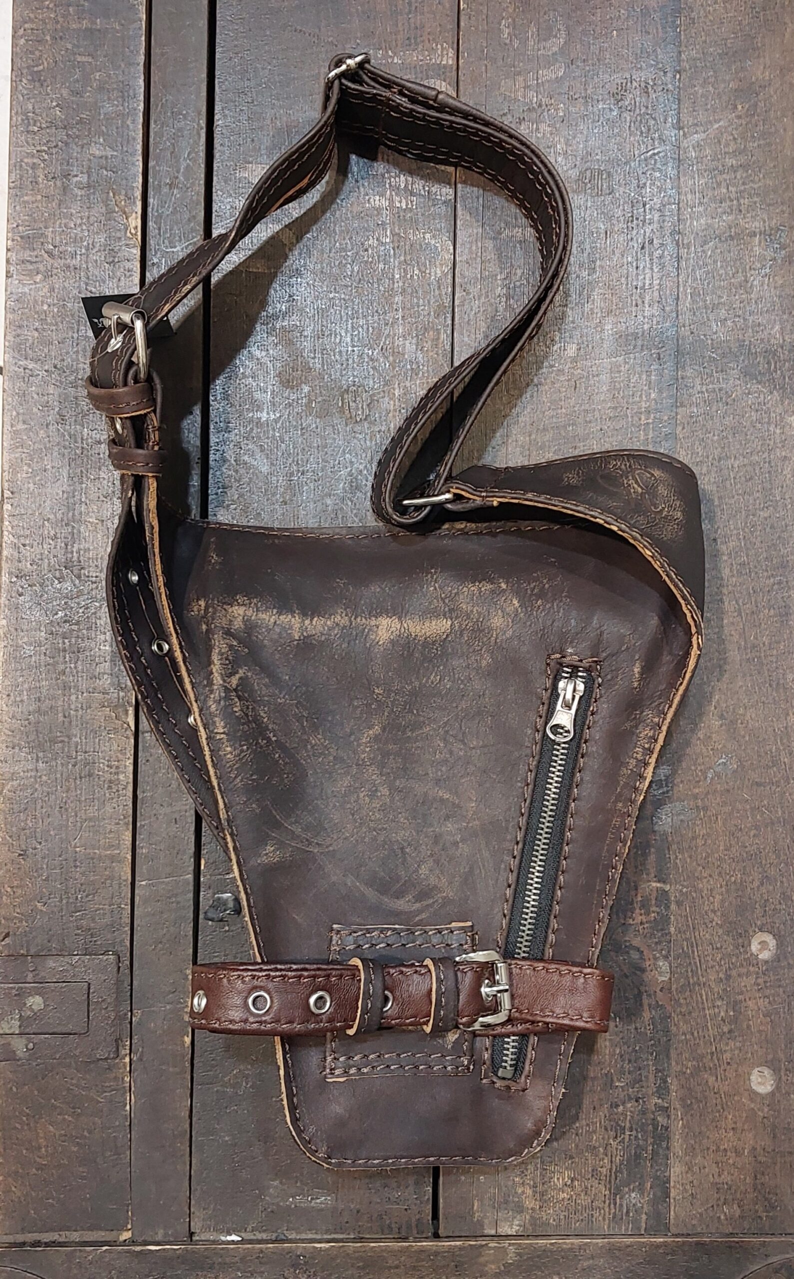 Skórzana saszetka motocyklowa. Mocowana na pas i nogę. Uszyta z mocnej skóry naturalnej. Kolor brązowy, lekko przecierany. Saszetkę ozdobiliśmy dodatkowo metalowym motywem skrzydeł i Indianina.