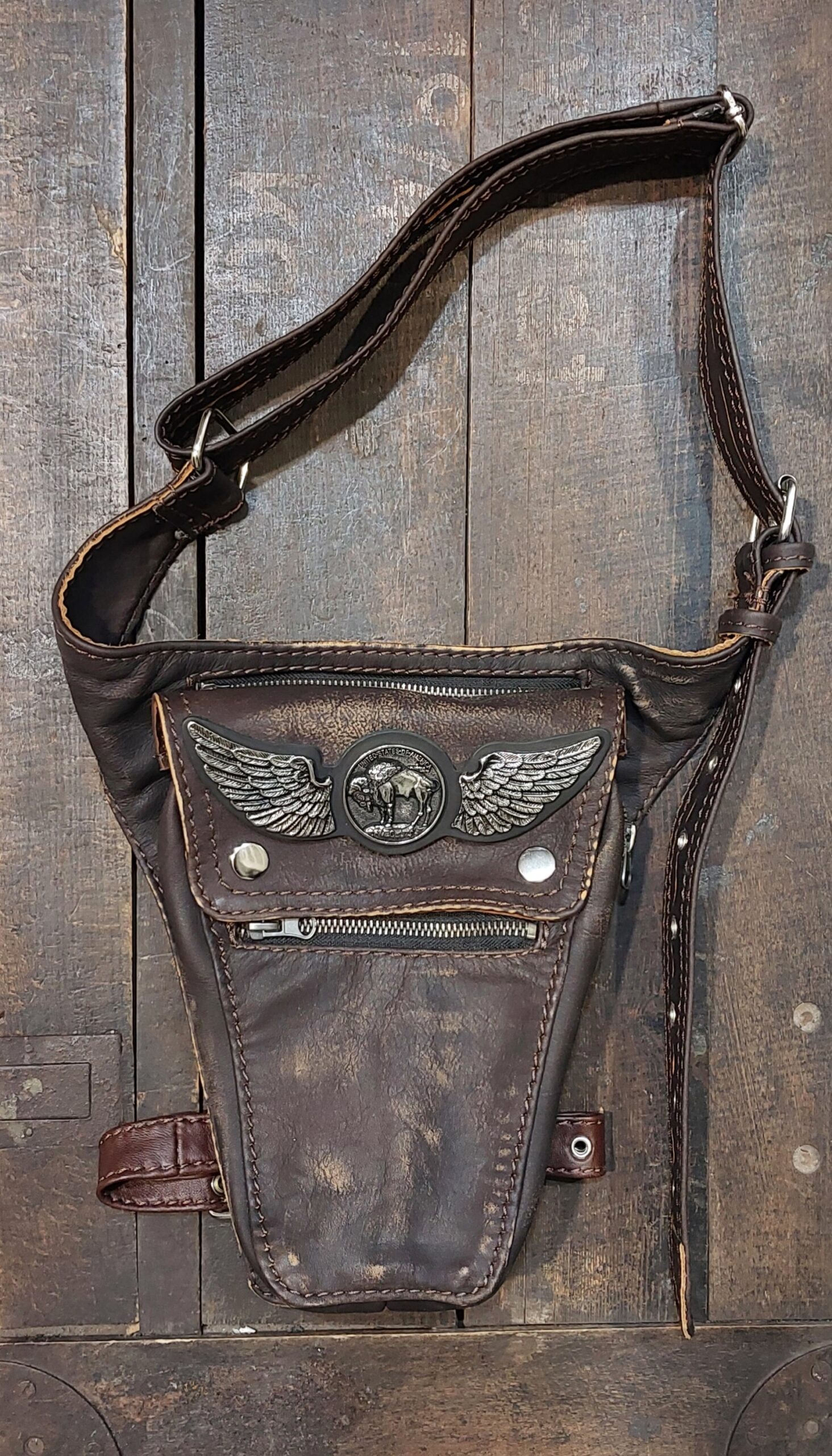 Skórzana saszetka motocyklowa. Mocowana na pas i nogę. Uszyta z mocnej skóry naturalnej. Kolor brązowy, lekko przecierany. Saszetkę ozdobiliśmy dodatkowo metalowymi motywami.